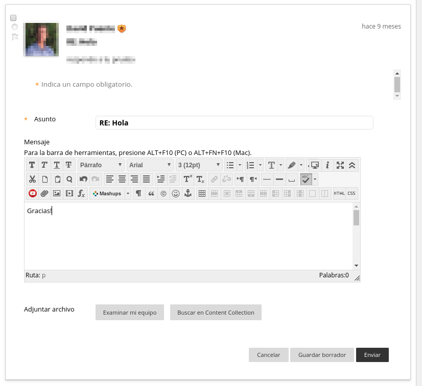 Tenemos posibilidad de añadir un adjunto también. Para terminar, pulsaremos Enviar. Podemos guardar el borrador y volver más tarde para terminarlo.
