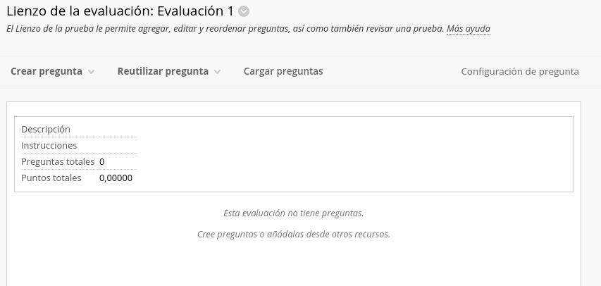 Crearemos un examen, encuesta o banco de preguntas pulsando Desarrollar evaluación / encuesta / conjunto, y añadiendo un nombre al mismo. Podemos añadir también una descripción e instrucciones. Al terminar y guardar, se nos mostrará el lienzo del elemento creado.