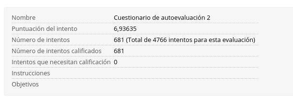- Intento-fecha-nota (solo exámenes) muestra el intento completo del alumno, con la fecha y nota conseguida. Este intento es el que se indicó en la configuración (primero, último, mayor...) como intento que pasaría al centro de calificaciones. En el caso de las encuestas, mostrará la fecha del intento.