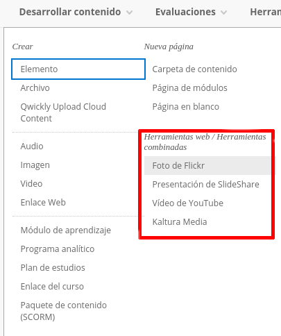 Podrás añadir elementos de vídeo de Youtube, presentaciones de Slideshare o fotos de Flickr (estas tres son estándar) y otras como multimedia de Kaltura. Nos aparecerá un cuadro de búsqueda donde encontrar el contenido deseado. Una vez seleccionado, configuraremos el enlace y listo.
