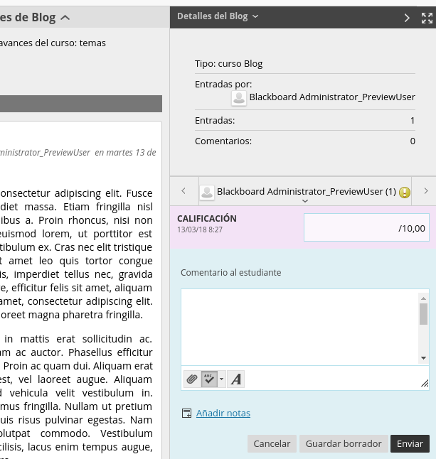 Podemos acceder a los detalles del blog o diario pulsando Detalles. Bajo estos detalles se listan las distintas entradas. Pulsando sobre ellas, podremos leerlas. Pulsando sobre el nombre del usuario,se abrirá el área donde calificar y añadir comentarios y notas (estas últimas son visibles solo a usuarios que pueden calificar, el alumno no las ve).