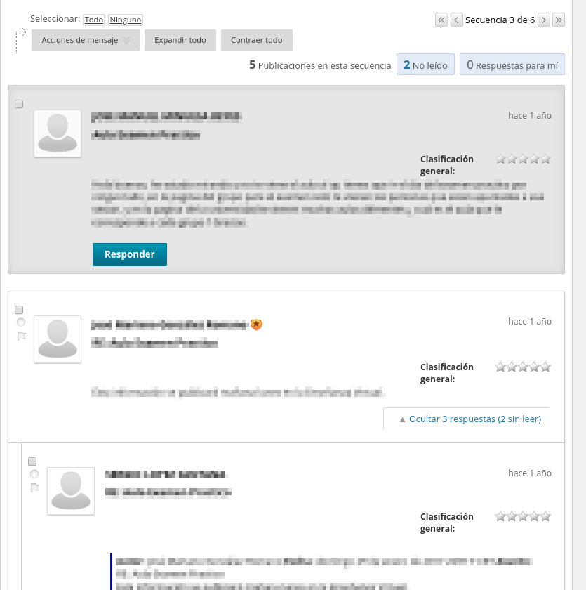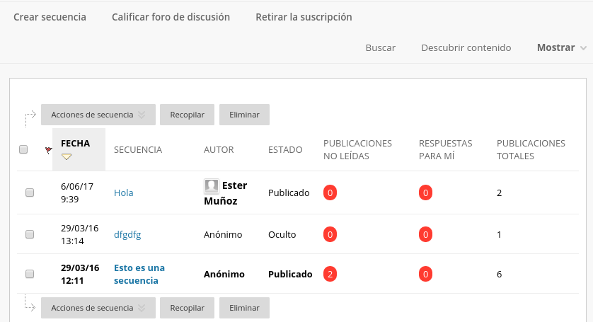 Podremos crear secuencias y suscribirnos al foro desde la barra de acciones, además de buscar y modificar la visualización. Con el menú desplegable de cada secuencia de mensajes, podremos marcar como leído/no leído, colocar/eliminar indicadores (una banderita), publicar/ocultar/marcar como disponible o no disponible/bloquear/eliminar una secuencia, así como recopilar. Si son varias secuencias, las marcamos y usamos el botón Acciones de secuencia para realizar estas acciones.