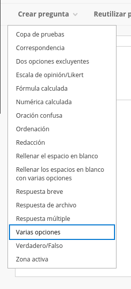 Para añadir una pregunta, pulsaremos Crear pregunta, eligiendo el tipo de pregunta que queremos crear entre las existentes, que son muchas y variadas.