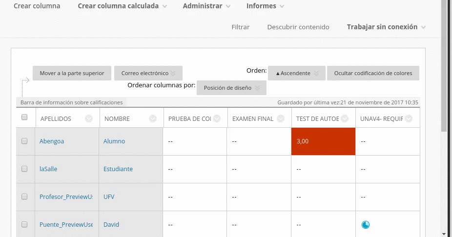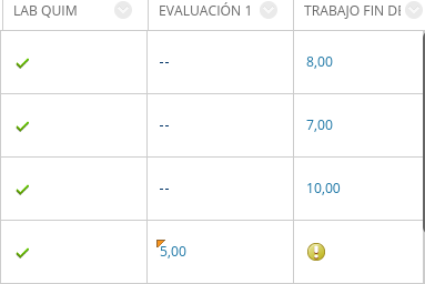 Los exámenes por su parte crean una columna en la que se visualiza la puntuación conseguida. Si están calificados parcialmente, aparecerá una marca indicándonos esta situación (Necesita calificación) y podremos acceder a calificar las preguntas restantes desde este mismo lugar.