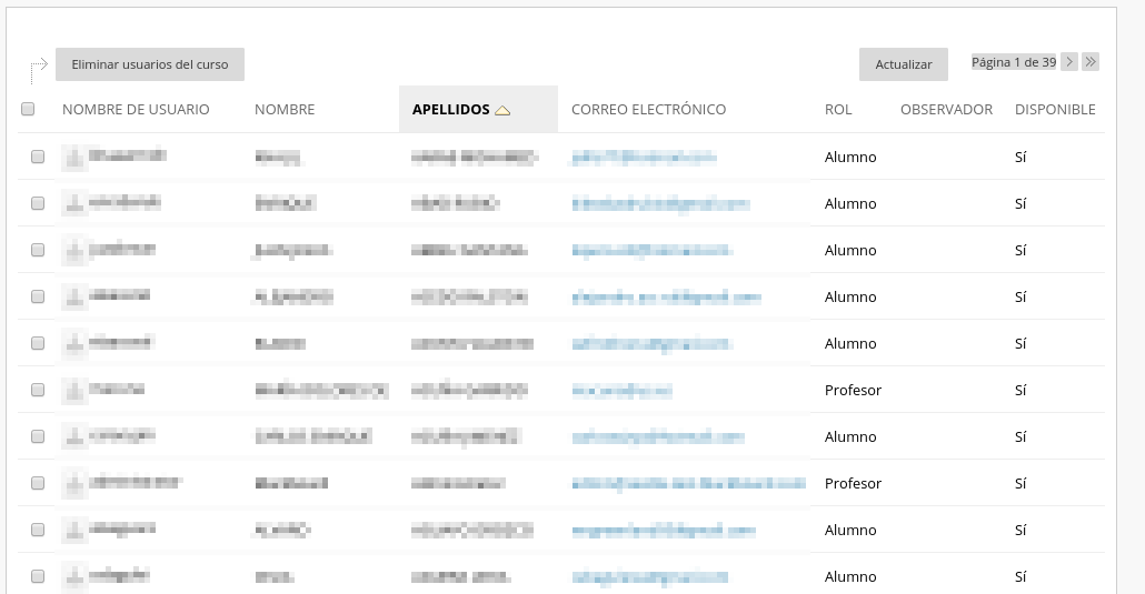 Podemos visualizar el listado de usuarios de un curso pulsando Panel de Control > Usuarios y grupos > Usuarios. En la pantalla veremos los datos de todos los usuarios que tienen acceso al curso. Es decir, podemos ver no solo alumnos, sino también ayudantes de profesor, profesores y cualquier otro rol.