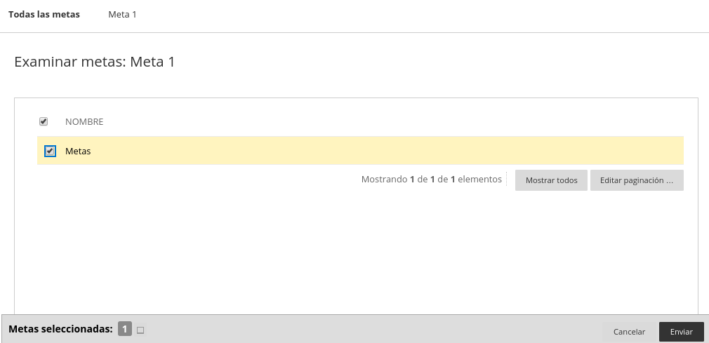 Podemos acceder a las metas alineadas con nuestro curso en general pulsando en Panel de Control > Herramientas del curso > Metas. Para asociar el curso a una meta, pulsamos Añadir asociación en la barra de acciones y localizamos la meta o metas a asociar de la ventana emergente. Una vez seleccionadas, pulsamos Enviar.