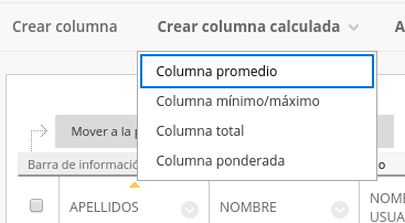 - Columna promedio. Mostrará como valor el promedio numérico de las columnas añadidas al cálculo. Puede servirnos para calcular el promedio de puntuación de un alumno en un cierto tipo de actividad. Por ejemplo, el promedio que el alumno ha conseguido en foros calificados.
