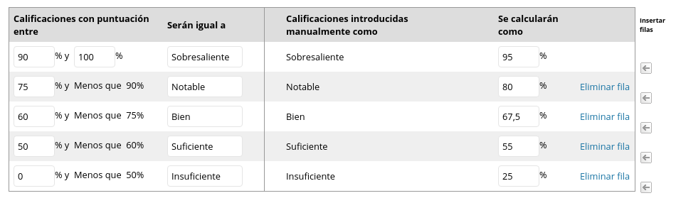 Veamos un ejemplo: Queremos calificar cierto trabajo de modo que el alumno reciba una de estas notas: Insuficiente, suficiente, bien, notable, sobresaliente. Necesitamos indicar a la columna qué valores en % corresponden con estos nombres para que pueda "traducir" esas calificaciones obtenidas a los valores que deseamos mostrarles a los alumnos como calificación. Crearemos una tabla similar a esta: