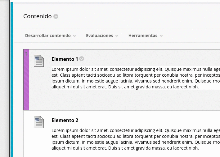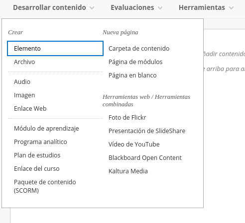 Aparte de los elementos listados a continuación, todos accesibles desde la barra de acción bajo el botón Desarrollar contenido, podemos añadir evaluaciones y herramientas, que iremos viendo a lo largo del curso.