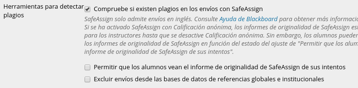 La actividad se tiene que configurar durante su creación para que se active SafeAssign. Se puede permitir que los alumnos vean el informe de originalidad de sus propios envíos, o evitar que los envíos realizados pasen a formar parte de la base de datos de documentos de la institución (útil en algunos casos, por ejemplo en trabajos que se revisan varias veces, para que las versiones no finales de los mismos no se incorporen a las fuentes y luego nos encontremos con falsos positivos al comparar un trabajo final con una versión intermedia).