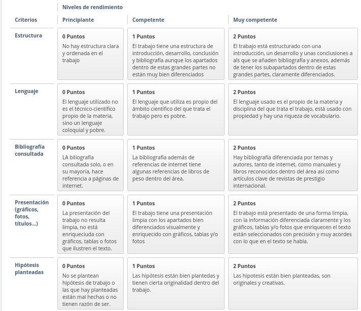 Son sencillas de utilizar. Al calificar con rúbrica, veremos una serie de criterios y para cada uno tendremos que elegir un nivel de rendimiento que se ajuste al del trabajo que estamos evaluando.