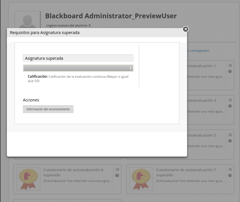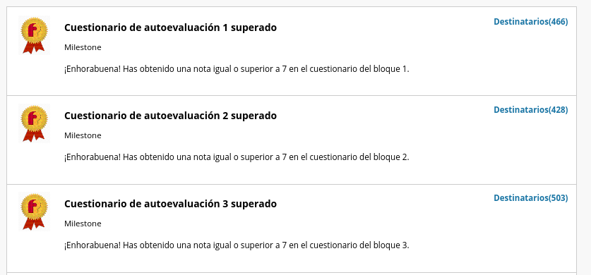 La herramienta Logros proporciona una excelente manera de premiar a los alumnos en sus avances (por ejemplo, pasar la primera parte del curso tras realizar todas las tareas) o bien al cumplir ciertos requisitos (como enviar más de tres posts al foro en una semana o recibir más de 8 puntos en un examen).