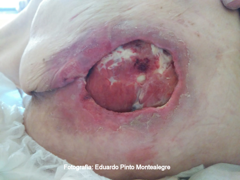 En la actualidad presenta UPP de grado lll en cadera izquierda, con bordes regulares, limpia y algo de tejido de granulación. En cadera derecha presenta UPP de grado lV, cavitada, con tejido necrótico, abundantes esfacelos, mal olor y con secreción purulenta. En zona sacra presenta otra UPP que aparece en la imagen.